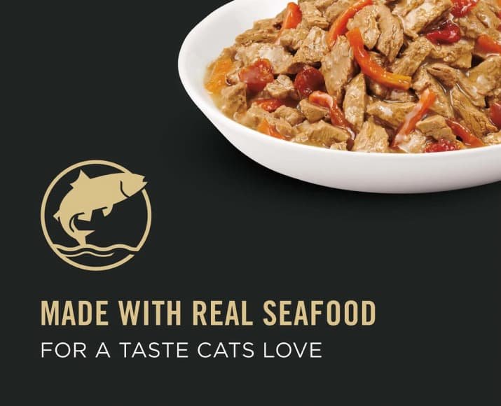 Give your kitty a sensory experience full of seafood yum with Purina Pro Plan Complete Essentials Seafood Stew Entree in Sauce Adult Wet Cat Food.